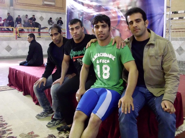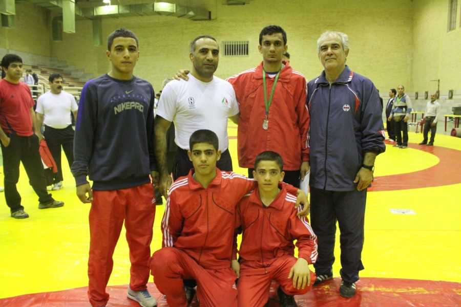 ابراهیم پوراکرمی و منصور قاسمی مربیان خوزستان در کنار احمد غلامی کشتی گیر اهواز
